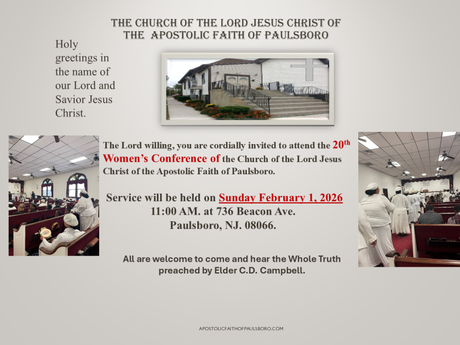 You are cordially invited to attend the Church of The Lord Jesus Christ, of the Apostolic Faith, of Paulsboro, where you will hear the whole truth of God's eternal word, preached in its fullness, by our Father in the Gospel, The Late Bishop S. C. Johnson, by the way of transcription, and Elder C. D Campbell, in person. Our teaching is based upon Holiness and the Apostle's Doctrine, and can always be found in the Bible.